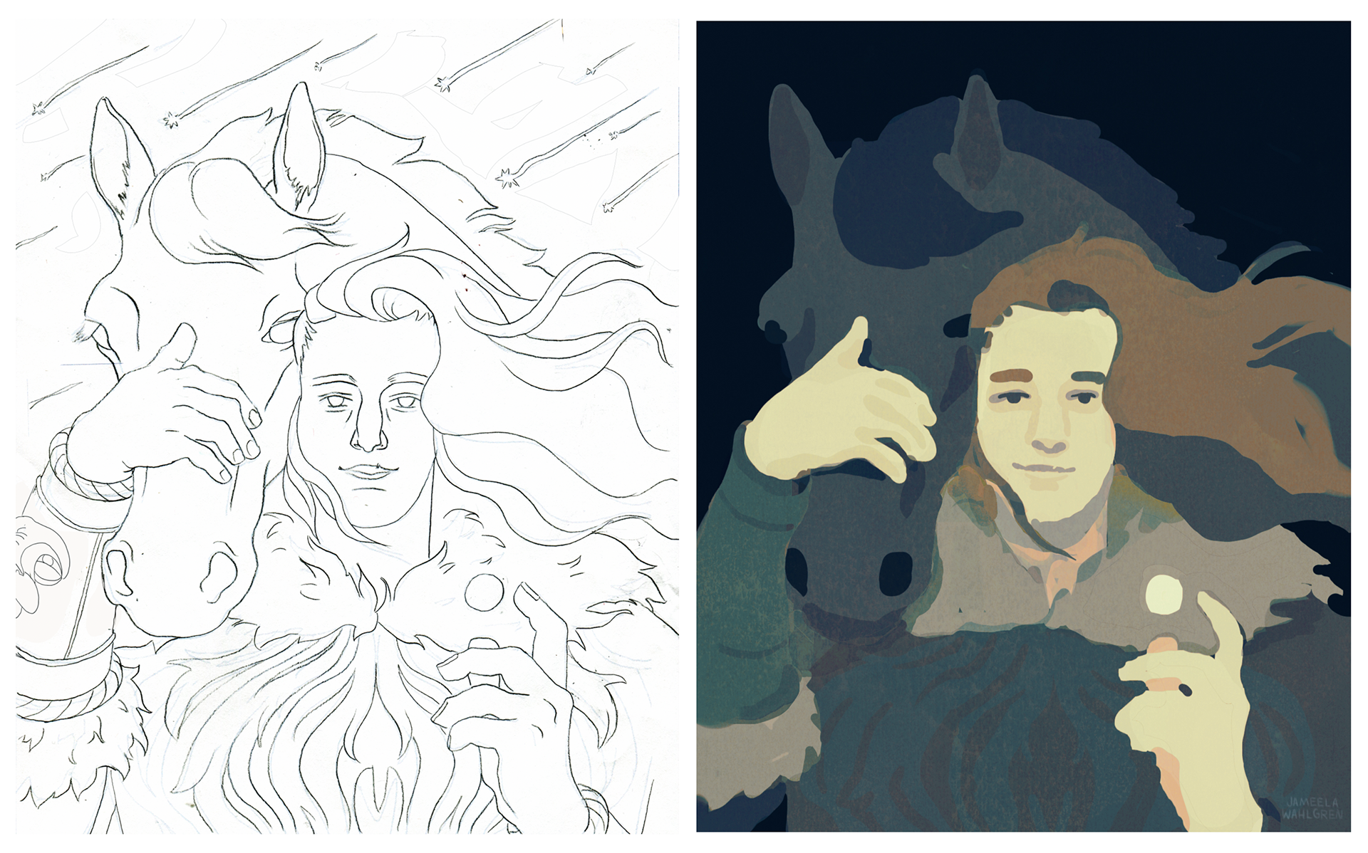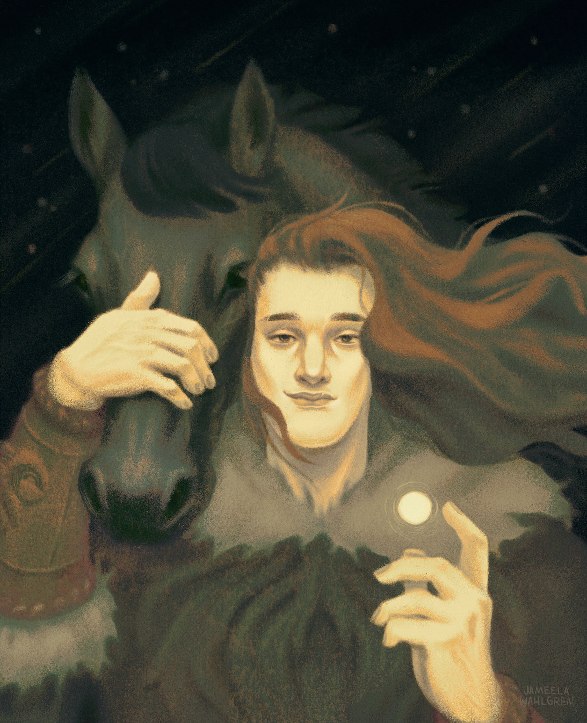 This art imagines General Radahn from the game Elden Ring as he might have looked as a young man. Taking his first steps into exploring magic and enjoying a friendship with his loyal horse.